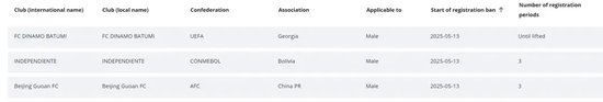 据国际足联转会注册禁令披露系统:北京国安被处以3个转会窗的转会禁令处罚。根据国际足联公布的信息,该禁令更新于2025年5月13日。